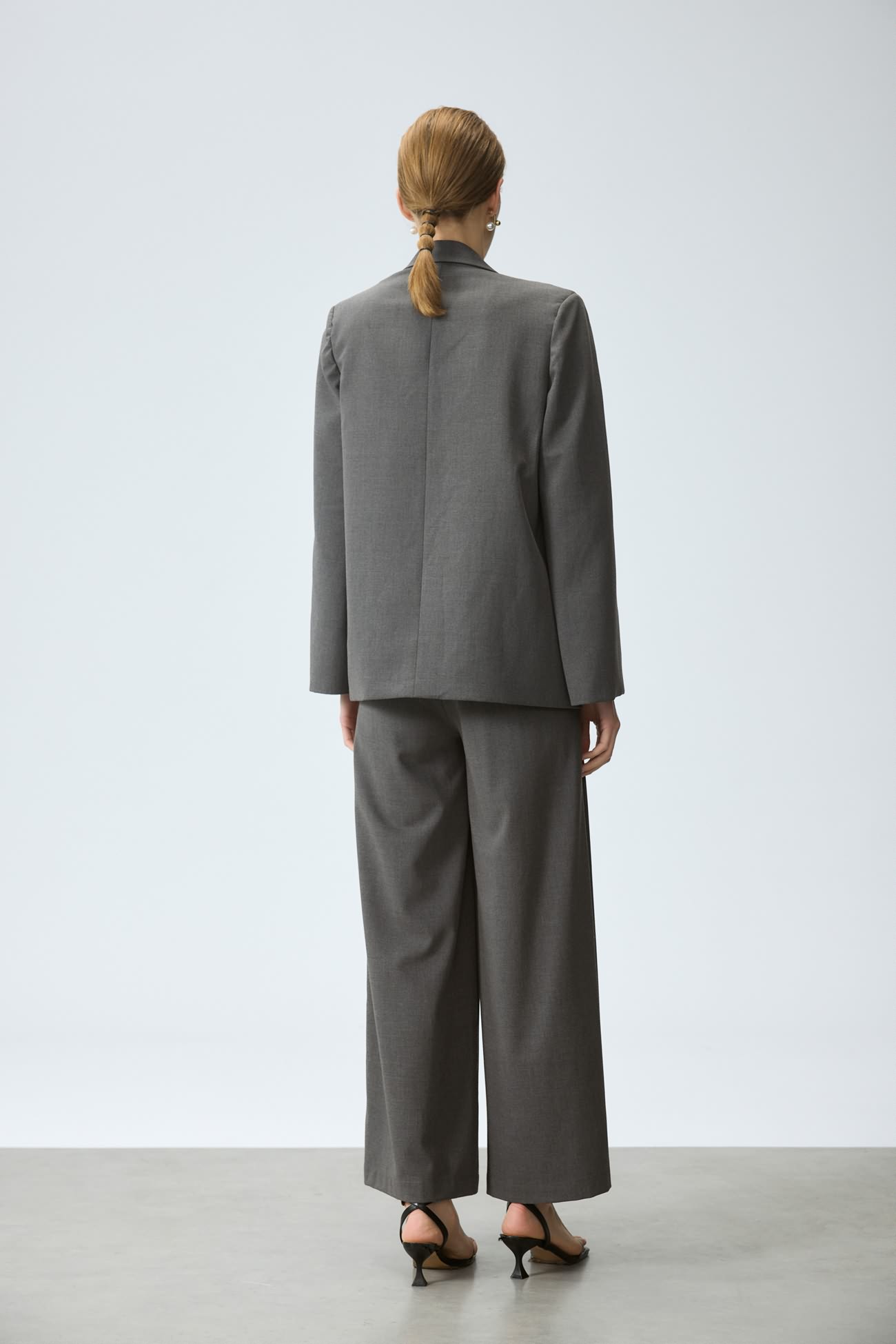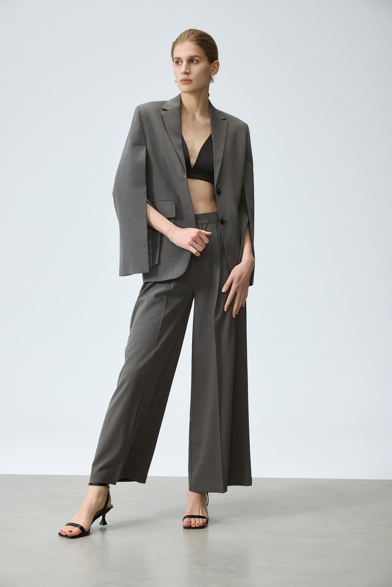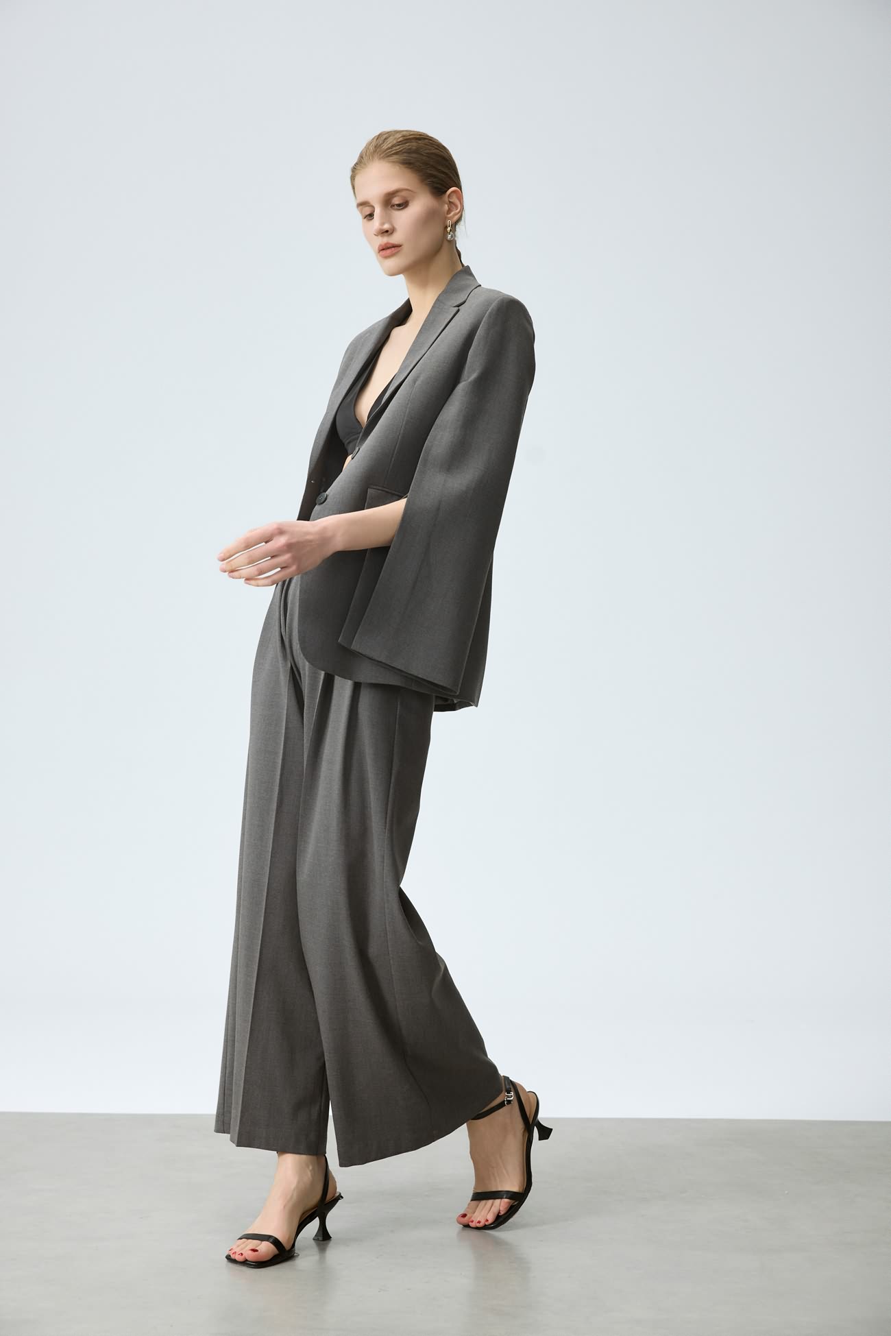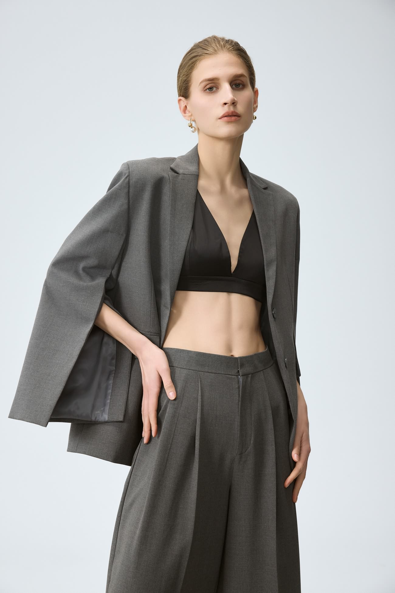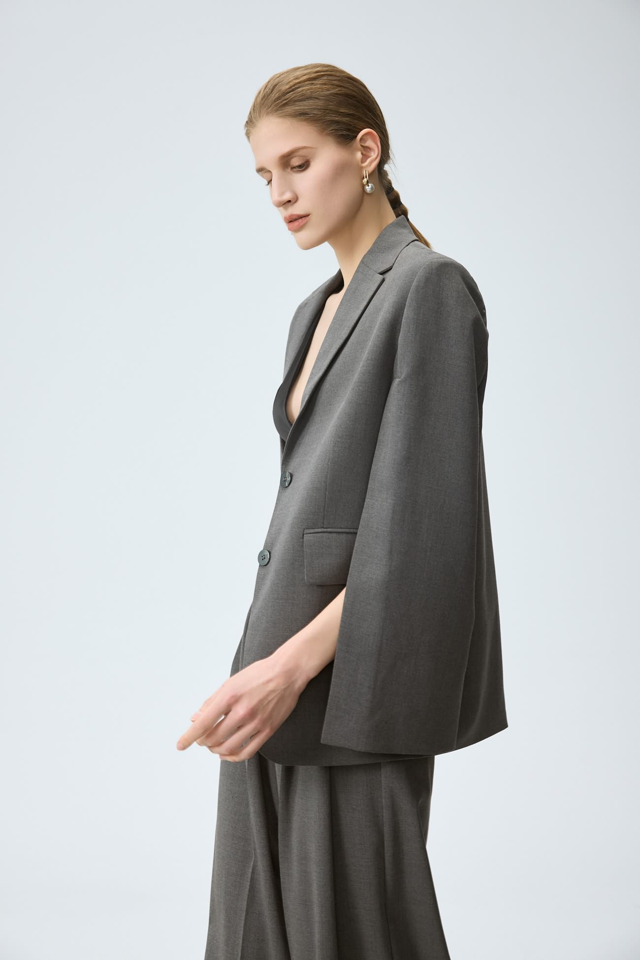 This coat combines a sense of competence and fashion. It is in the style of a suit, featuring a classic notched - lapel design, which showcases a formal and neat temperament. With a loose - fitting cut and bat - wing sleeves, it adds a casual and laid - back atmosphere, breaking the stereotype of traditional suits. The gray color is composed and elegant, suitable for various occasions, whether business - related or casual. Paired with trendy inner - wear items, it highlights a modern urban chic style, integrating elements of professionalism and fashion trends.