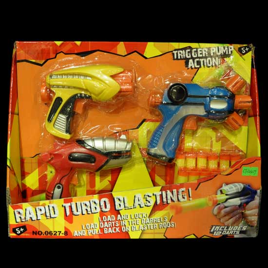This dart gun set includes three toy pistols and 12 dart bullets. Children can pull the trigger to pump and shoot the dart out. It is a safe and exciting playset for boys to enjoy an imaginative gun fight.