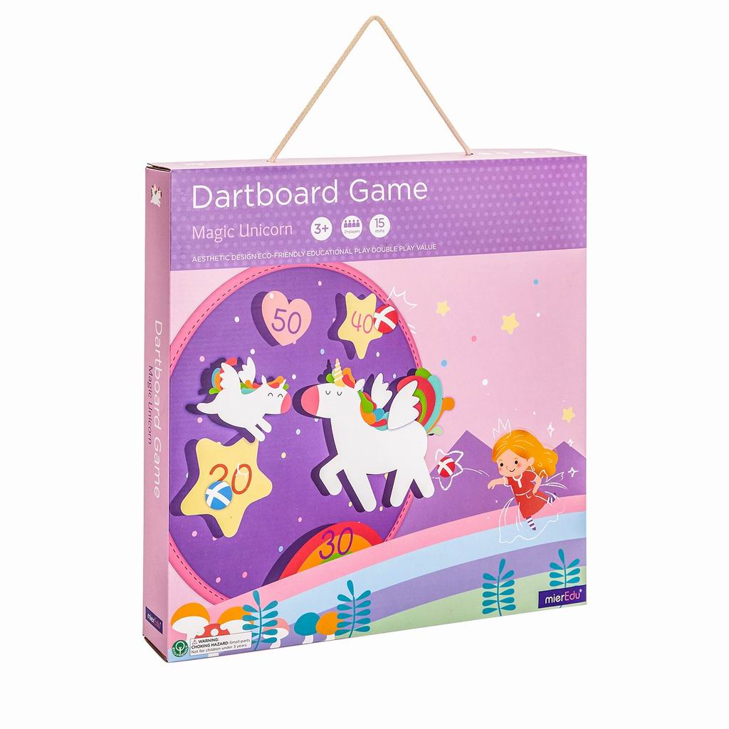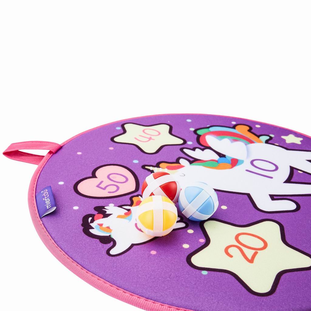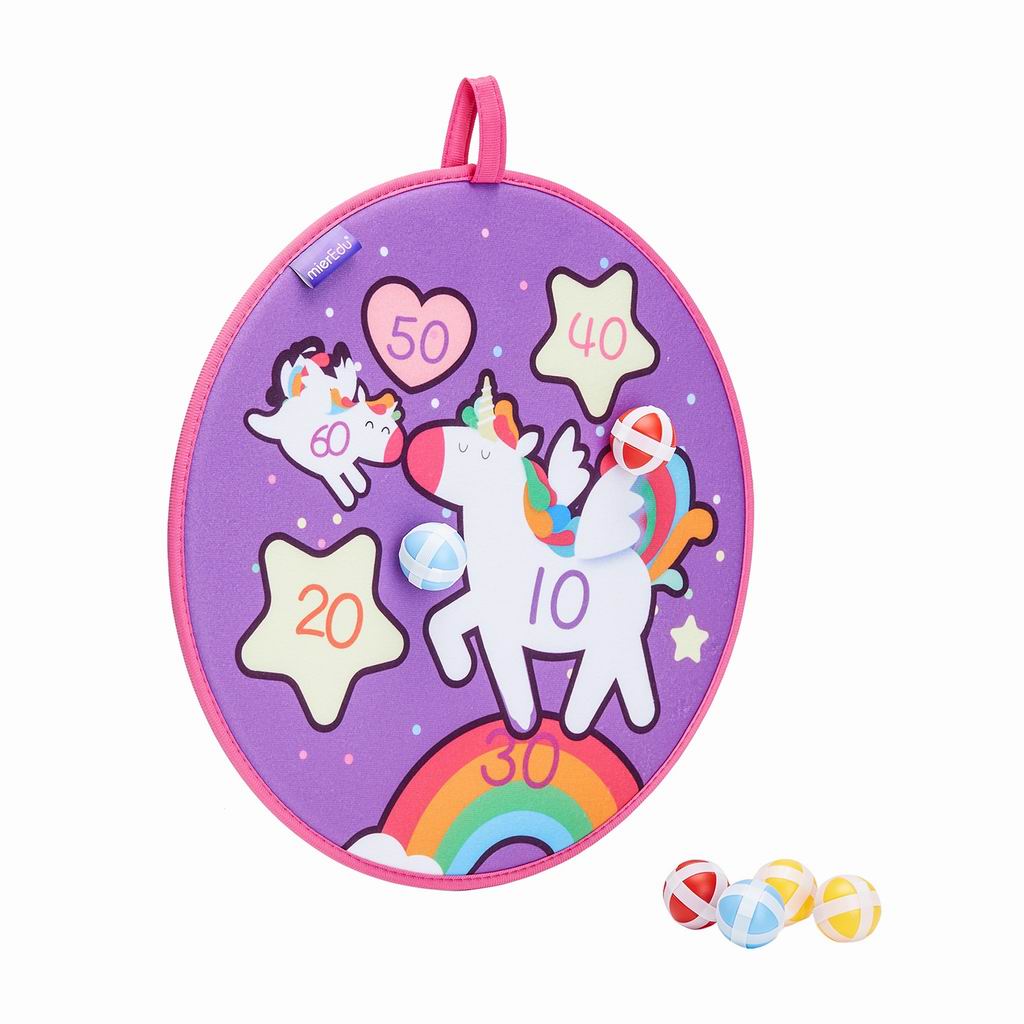 A beautiful soft fibre dartboard designed for hours of fun play. This dartboard allows kids to practice their shots with six balls as they learn numbers and essential counting skills. The double-sided dartboard features an easy level for smaller children, and a slightly more challenging level on the other side for older children. With its easily-detachable adhesive strap, it can be hung on a wall or door and makes the perfect toy for parties or team play!