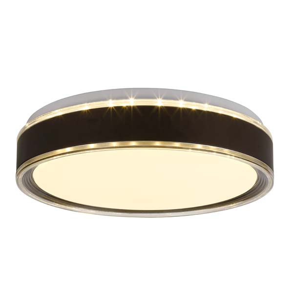 This is a round ceiling light. It is round as a whole, with a black decorative band in the middle. The upper and lower edges of the decorative band are embellished with golden lines, and there are also some light - emitting points distributed. Below is a circular light - emitting area that emits warm yellow light. It is exquisitely designed and has a sense of hierarchy. It is usually used for indoor lighting, which can create a gorgeous and warm light atmosphere for the room.