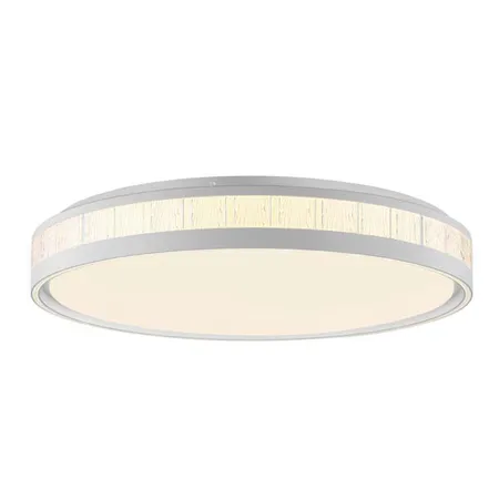 This is a circular ceiling light. The main body of the lamp is light gray, and there is a decorative strip with a light-transmitting material similar to wood grain texture around the edge of the lamp body, which can emit soft light when lit. The center of the lamp is a large-area milky white luminous panel. The overall design is simple and modern, suitable for indoor lighting in homes.