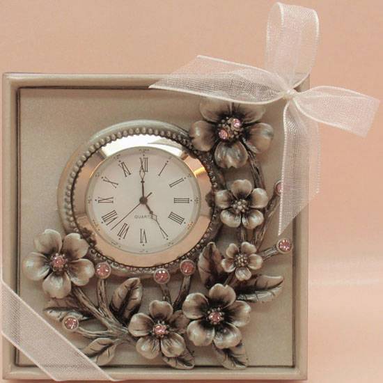 This elegant mini clock features an ornate cherry-blossom design. It is lavishly decorated with pink Czech stones on each of the flowers. Coming with a deluxe gift box, this mini clock is a fine gift for anyone.