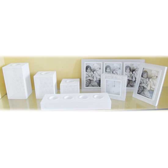 This is a decoration set including a mesh metal clock, two collage frames and four tea-light holders. This decoration set is made of high quality materials to ensure a long lifespan. This decoration set is a great addition to your modern household.