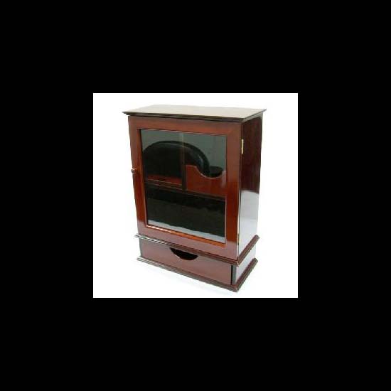 • The cupboard is made of wood, with a glass covering the exposed shelves