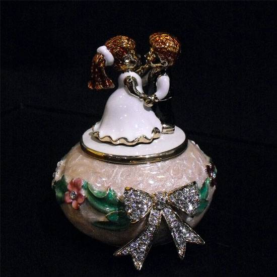 This decorative box has a pair of little alloy couple on the lid. There is a large and eye-catching ribbon bow decoration with crystals for extravagance. This sweet jewelry container is the right wedding gift.