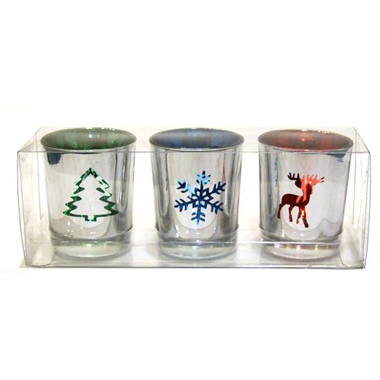 The items shown on the picture are a set of three decorative cups. They are featured with different Christmas related figures, which are a green Chirstmas tree, a blue snowflake and a red reindeer.