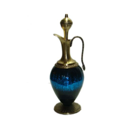 Featured here is a decorative glass jug that is great for household decoration. This unique glass jug is adorned by ornate brass details at the bottom and on the top. Add this graceful glass decoration to your home for a unique touch of style.