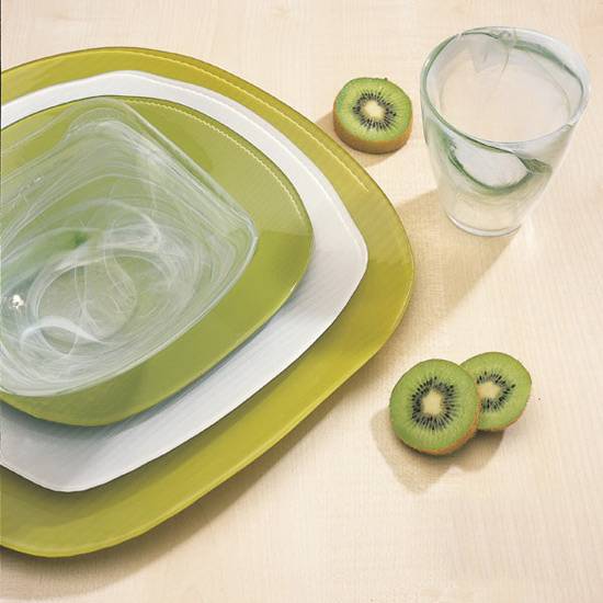 • This is a glass tableware set which includes matching glass plates and salad bowls.
