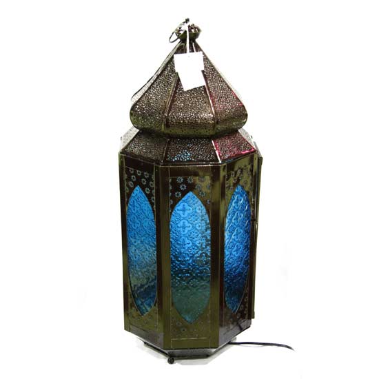 Add a touch of romance to any home decor with the featured lantern. Its panels feature blue glass patterned with small crosses. The lantern has a pointed top and gives an antique feel.