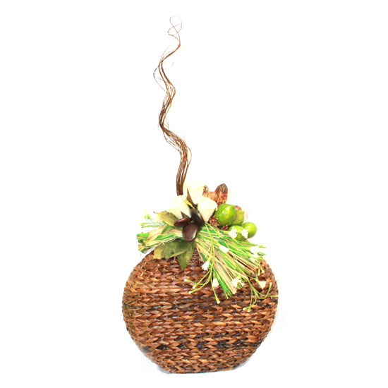 Displayed is a rustic decorative vase featuring natural abaca construction. It is finely made with exquisite craftsmanship and adorable details. This decorative vase brings a touch of nature to your home decor.
