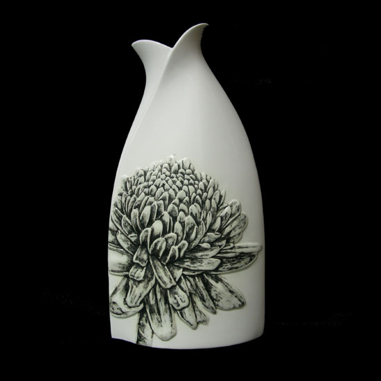 An embossed ginger flower is meticulously hand-painted in impressive detail to give a charming decorative vase. Slightly curved to form two opening petals on a blossoming flower bud, this enchanting vase design combines the notable strength of porcelain with exquisite craftsmanship.