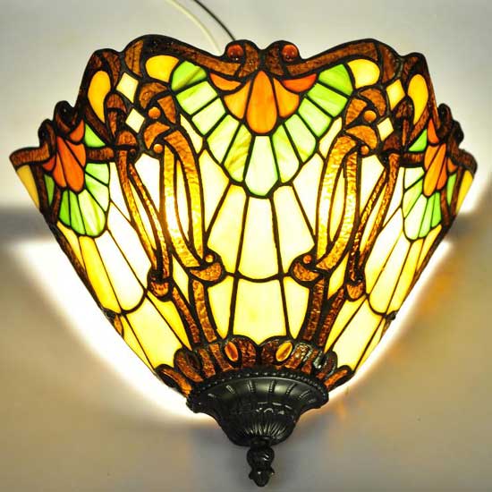This wall lamp flaunts a classic European design to fill the room with a sense of elegance. The lamp is designed in a flower shape with beautiful patterns formed by colored glass. A metal lamp base is added to create a vintage style.