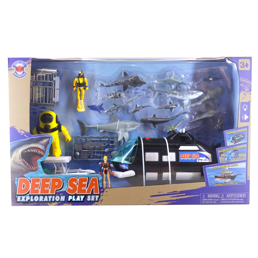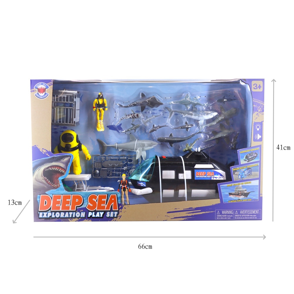 Fully enclosed submarine simulation real, with sound and light function, equipped with 3*AG13 button cells. That two divers and a simulated diving suit better let children know the function and fun of diving. The product comes with multiple sizes of sharks and accessories to stimulate children's imagination and develop children's manual skills.