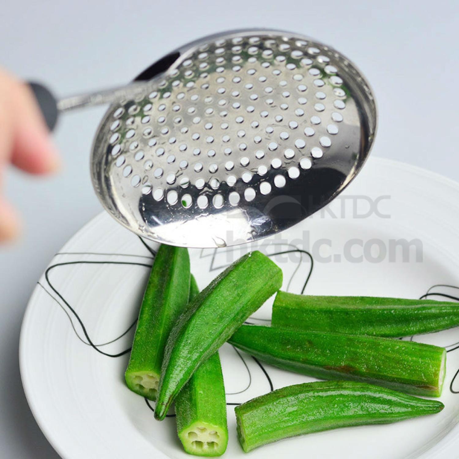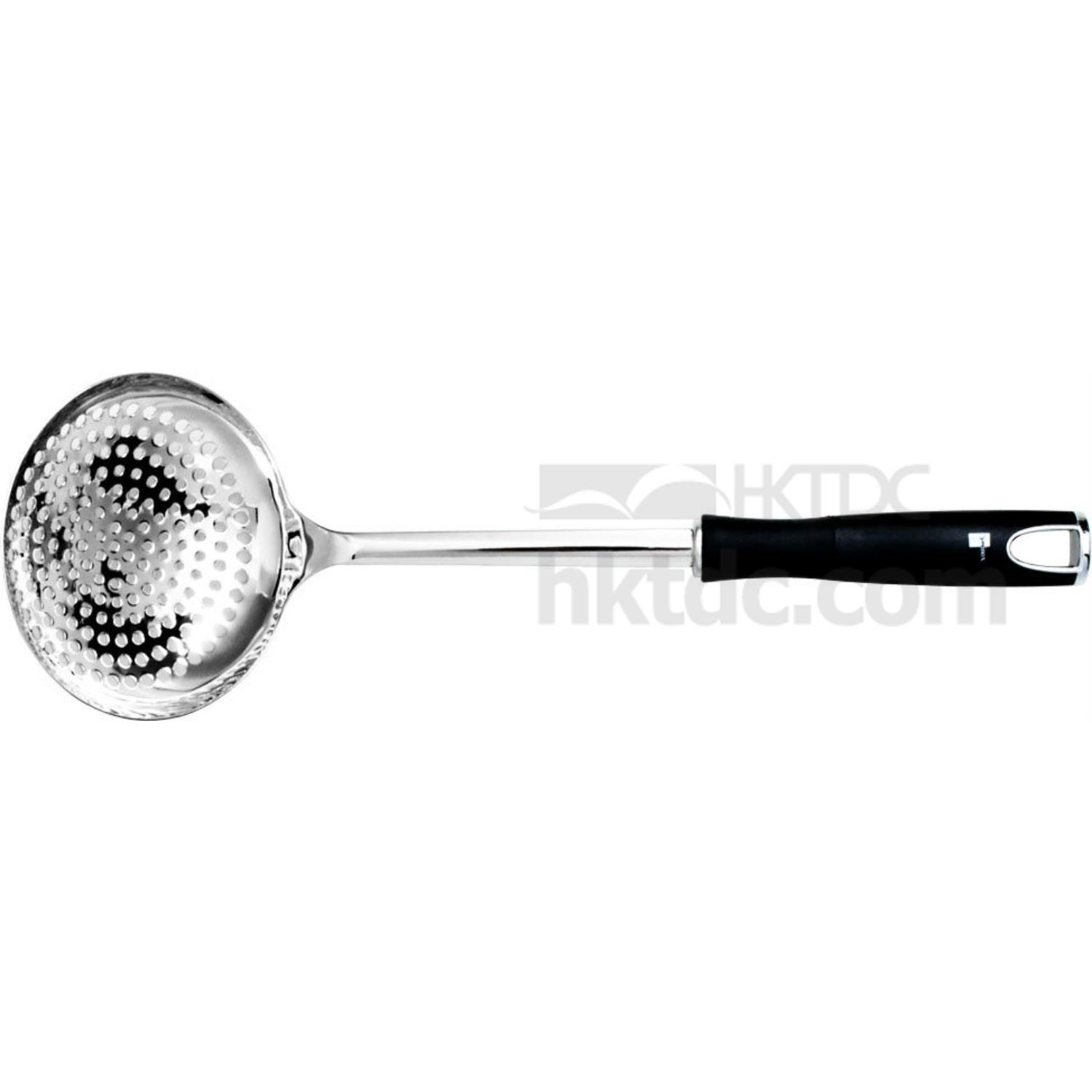 Removing fats and froth off the top of stews, this deep skimmer features a streamlined handle of heat-resistant design and a soft-polished round bowl with numerous punched holes. It is also a wonderful utensil for cooking dumplings or taking out soup ingredients.
