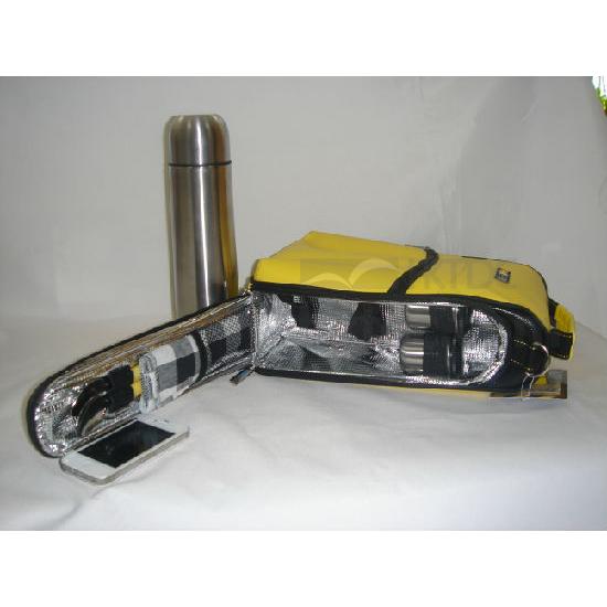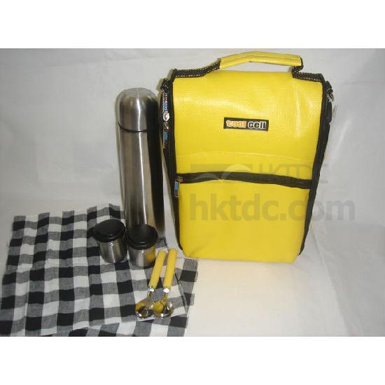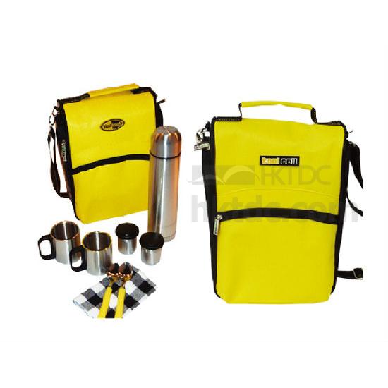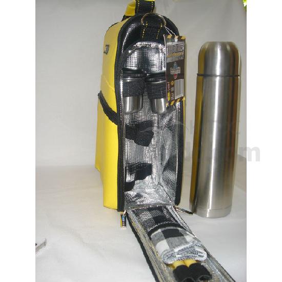 Description: 750 ml stailess steel flask, 2 double wall stainless steel coffee mugs, stainless sugar/milk containers, 2 napkins & teaspoons & shoulder strap