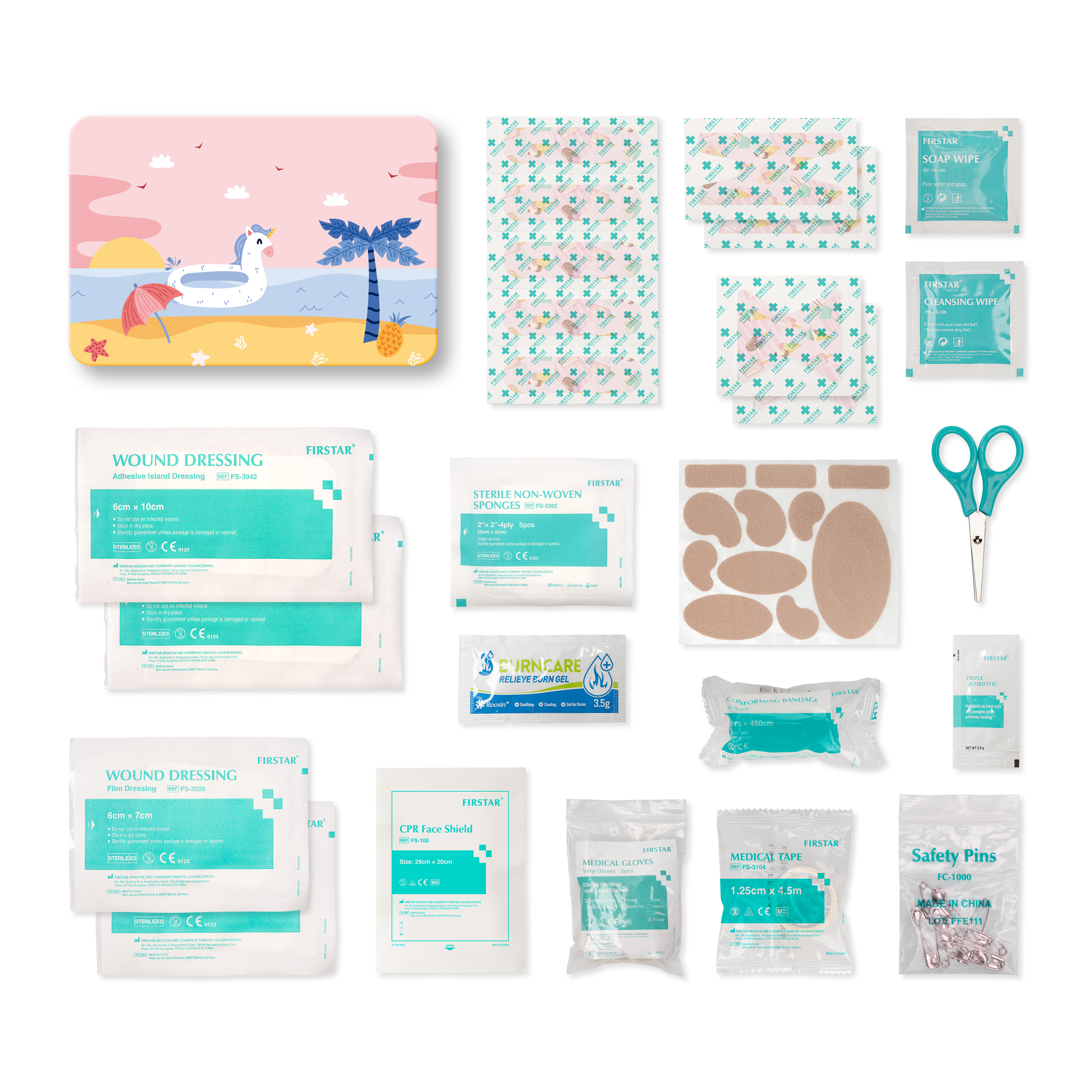 It is made of tin material with fashion design, containing essential first aid items that can be used to deal with small injuries.