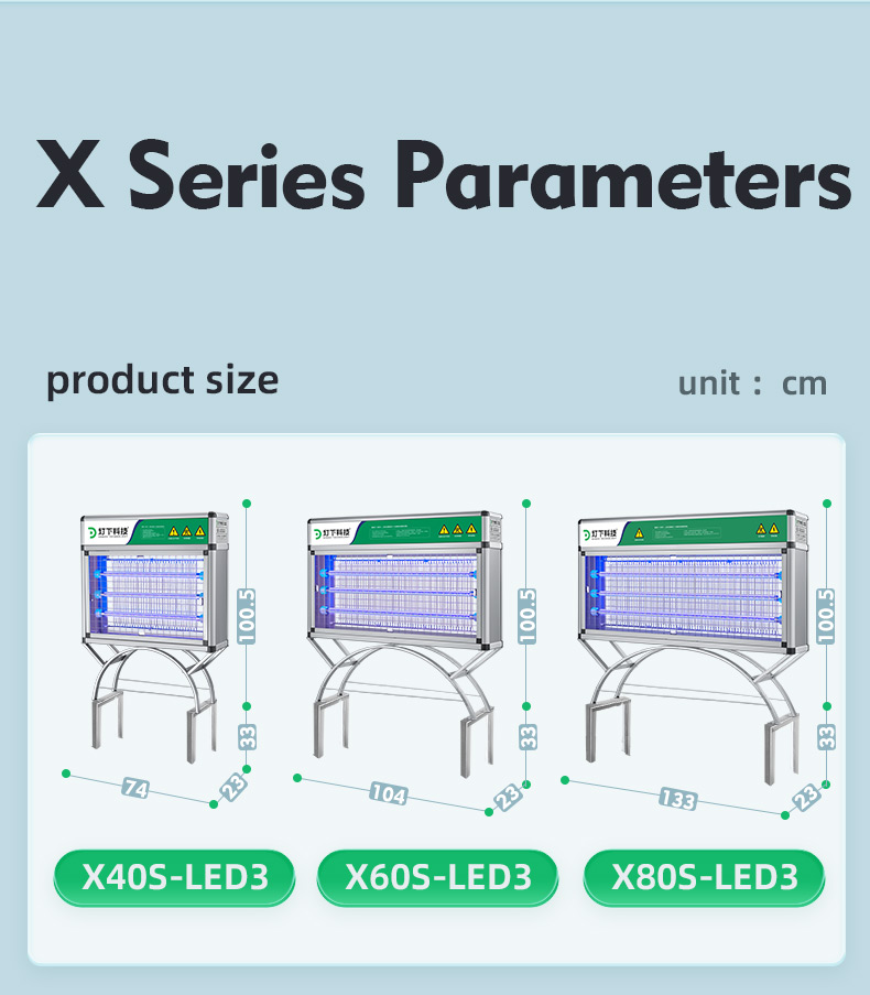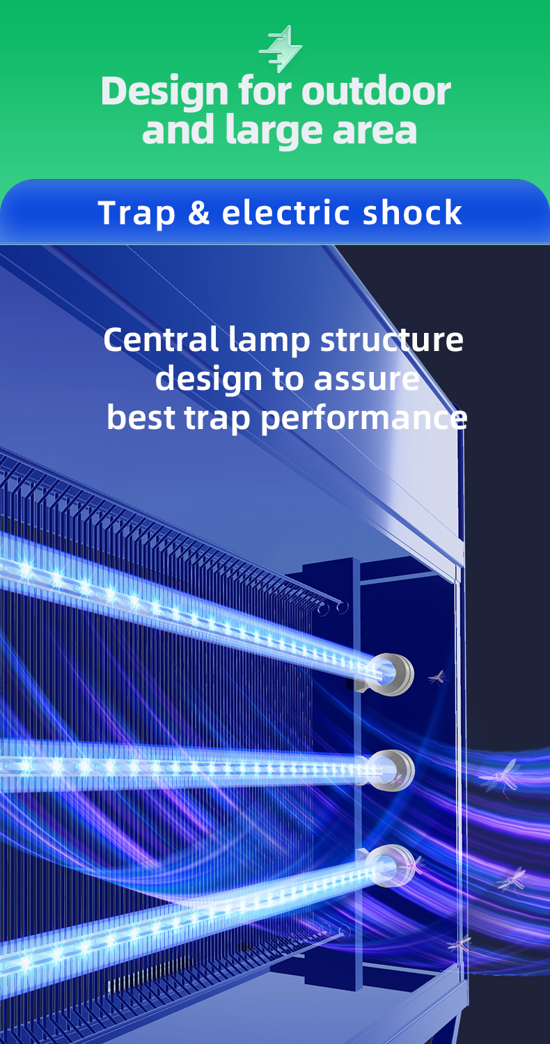 The X40S outdoor mosquito killer is designed for small to medium-sized outdoor spaces, offering dual power modes of 40W/75W and equipped with three sets of high-efficiency UVA mosquito-attracting tubes, covering an area of 160-190 square meters. Featuring a waterproof and rain-resistant structure, it is suitable for community gardens, private courtyards, restaurant outdoor dining areas, hotel terraces, and similar settings, providing precise and long-lasting mosquito control.