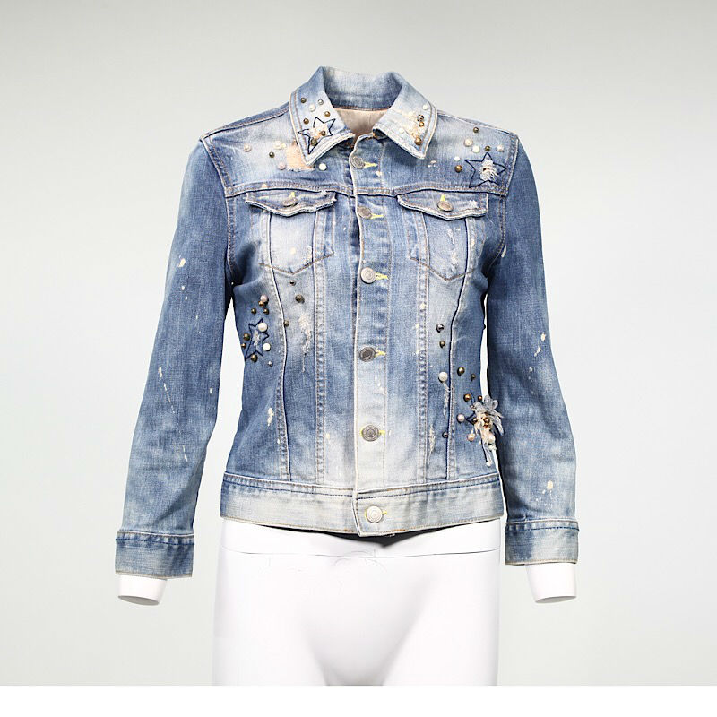Create a chic casual look for weekend outings with this charming denim jacket. Heavily washed with destruction for a well-worn look, it is furthered accented with bead detailing and embroidered embellishments to lend a glamor edge.