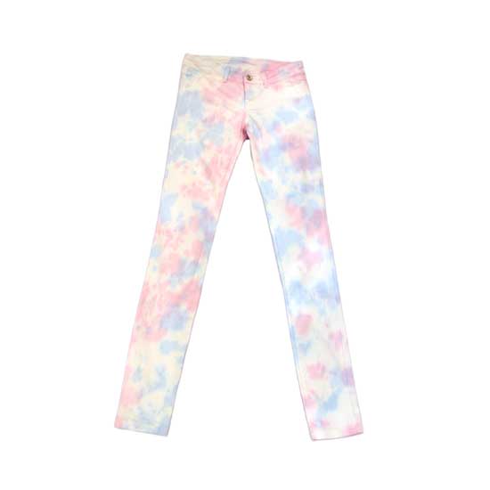 This pair of denim pants features specially-dyed light pink and blue patterns on the white background. It is made of pure cotton for maximum wearing comfort. This pair of leg-hugging denim pants is great for modern ladies.