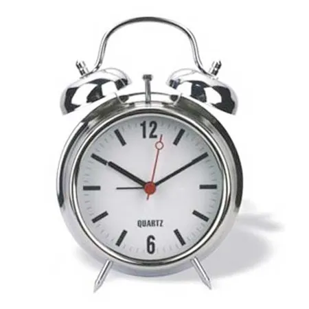 This desk alarm clock features a classy twin-bell design. The white sun-ray dial is designed three watch hands. The metal housing showcases a chrome finish.