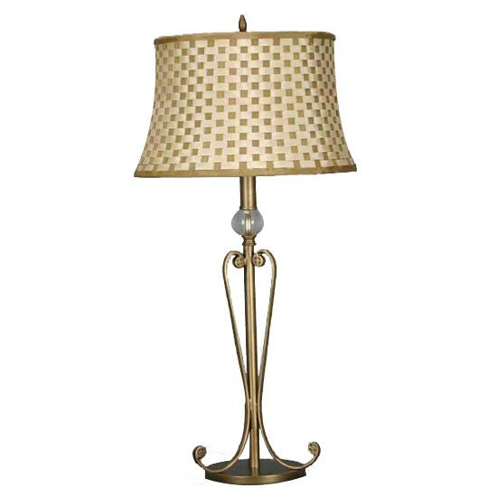 This is a desk lamp which is made of a metal base and a straw lamp shade. The lamp is powered by 1 light bulb.