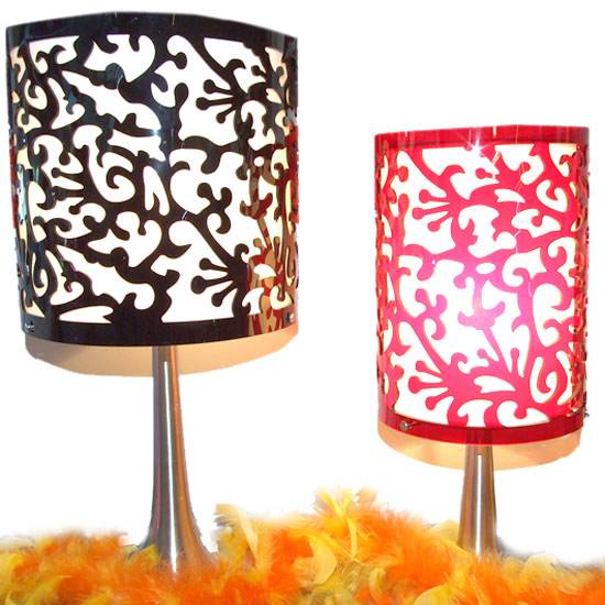 These are decorative desk lamps. The lamp shades feature an artistic openwork design. Black and red colors are available.