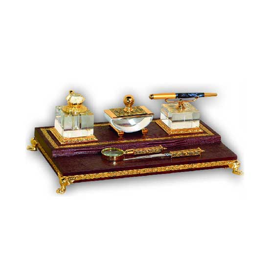 This is a Brussels luxury desk set that comes with a pen, a holder, a magnifier and so on. It is designed in a glistening golden hue with delicate details. This refined desk set is a wonderful gift for precious friends.
