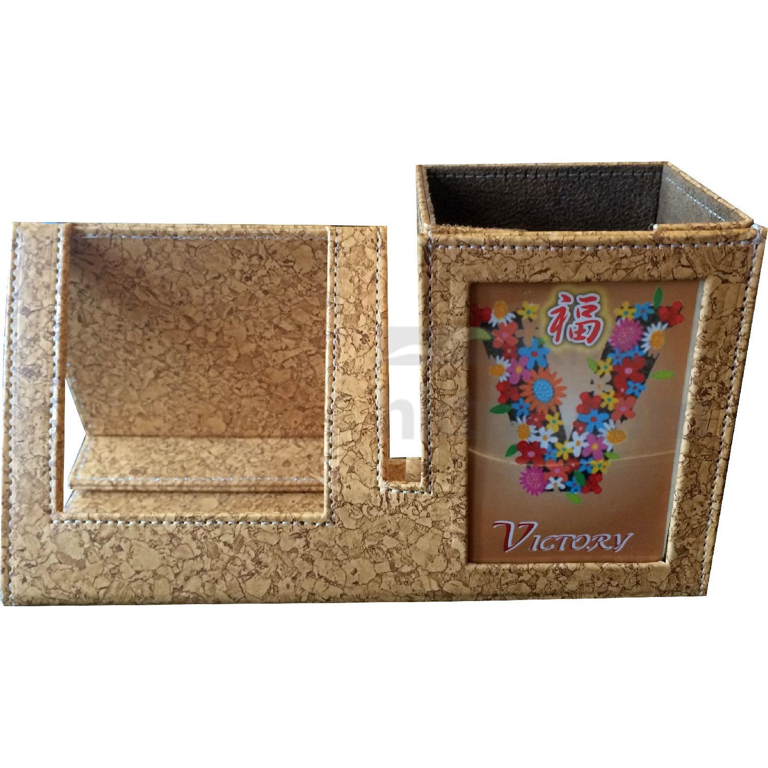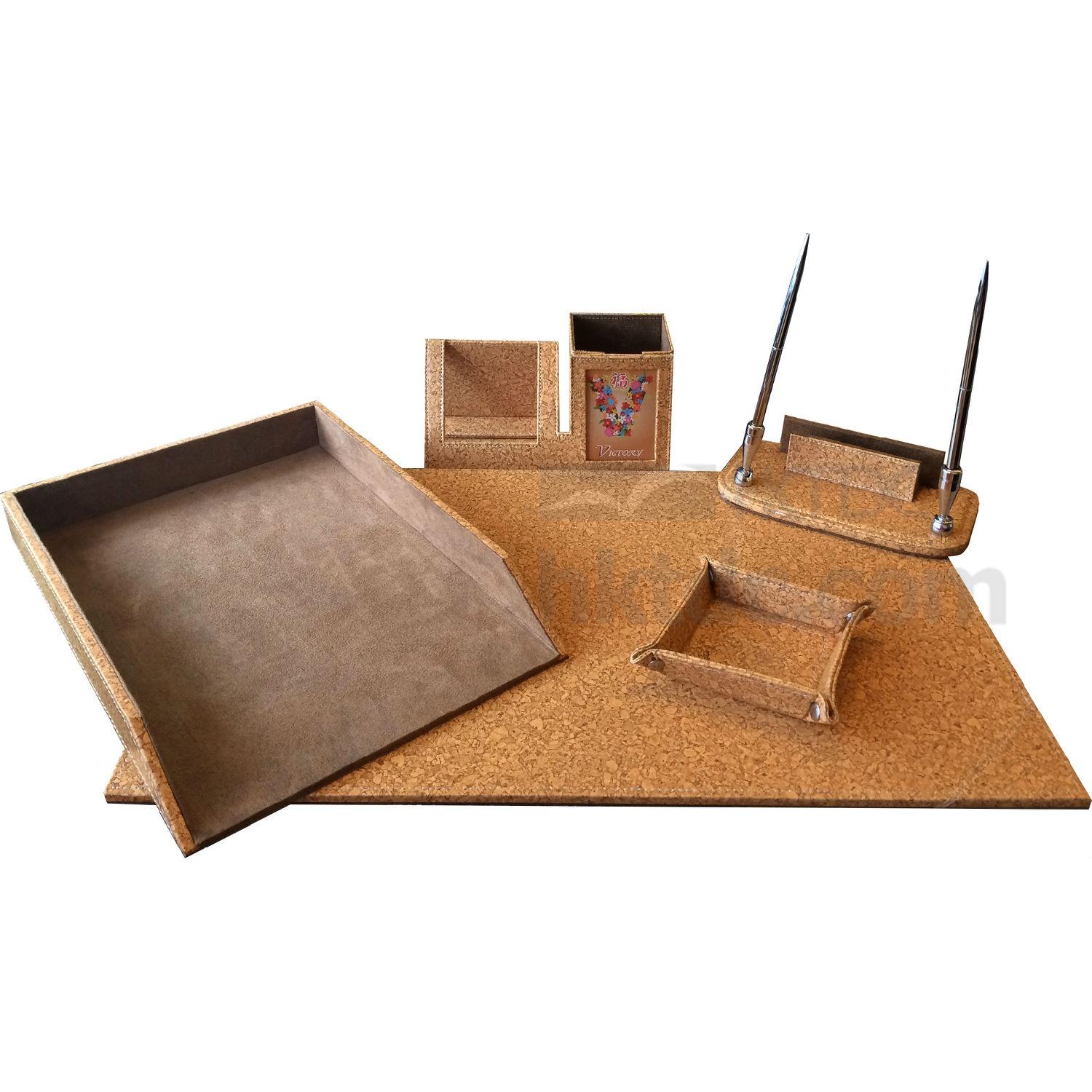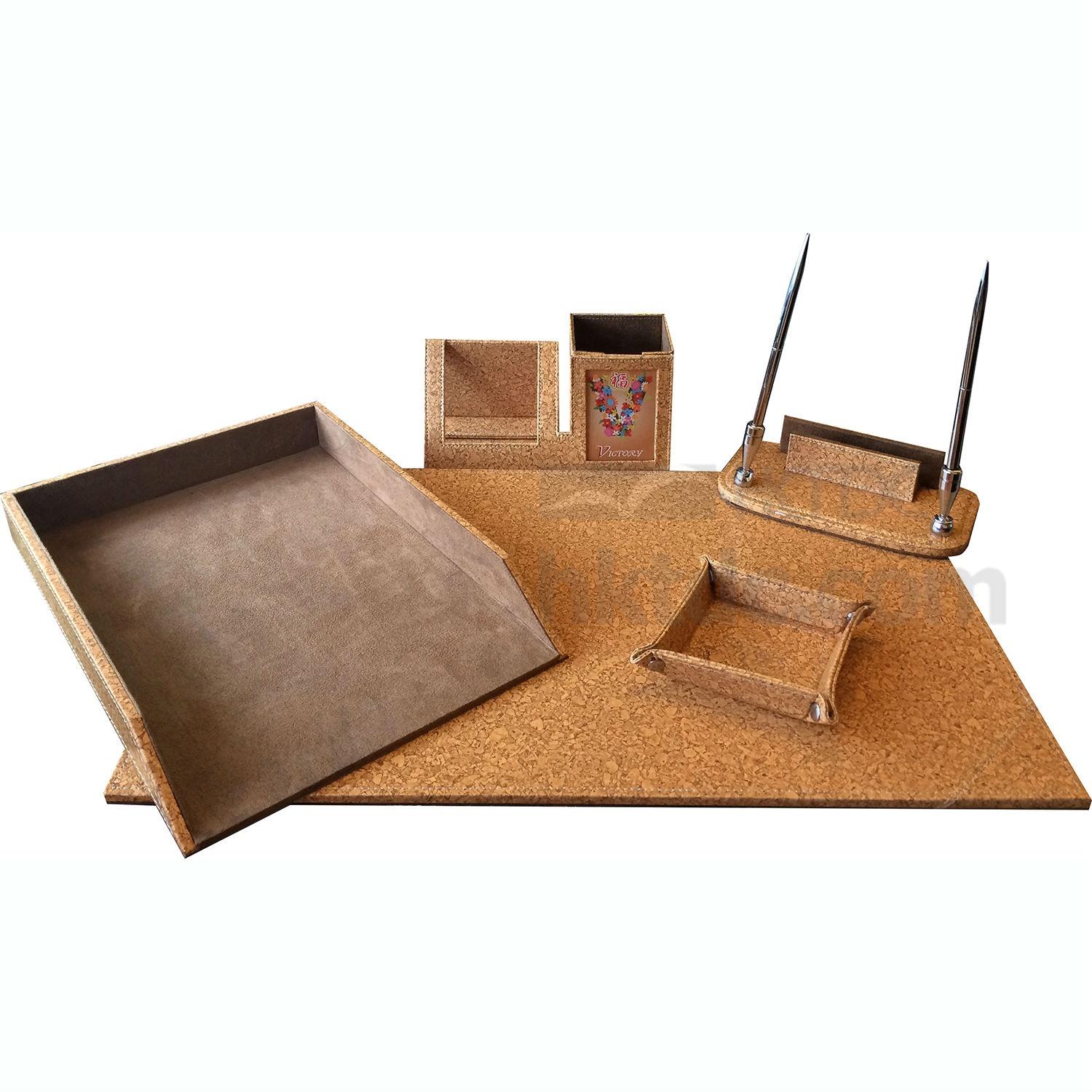 Made of high quality PU, this desk set includes a desk pad, a document tray, a pen stand with a card holder, a mini tray and a phone/calculator holder with a frame and pen cup. This stationery set comes in brown cork texture for a natural touch. With exquisite and meticulous craftsmanship, this stationery set is designed for those who love green products. Let your desk full of vitality with this durable desk stationery set.