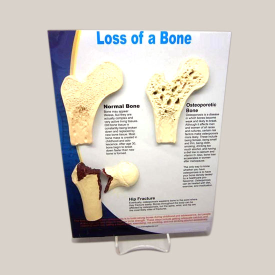- Display board with anatomical bones showing normal bone, osteoporotic bone, finally hip fracture.