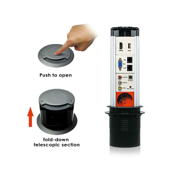 This mini desktop column is widely used in households, offices, hotels, libraries, training rooms, meeting rooms and conference halls. It comes with a foldable design for convenience. When connected, it also provides a cable grommet function, completely hiding the connections.