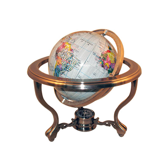 This is a desktop globe featuring a streamlined stand with golden painting for a deluxe touch. It is finely printed with detailed geographic patterns in brilliant colors. This elegant globe is a great decoration for your office.