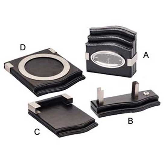 Showcased here is a desktop holder set that comes with four pieces. It includes a document holder clock which is highly functional. Documents can be placed in the holders and you can tell the time from the clock.