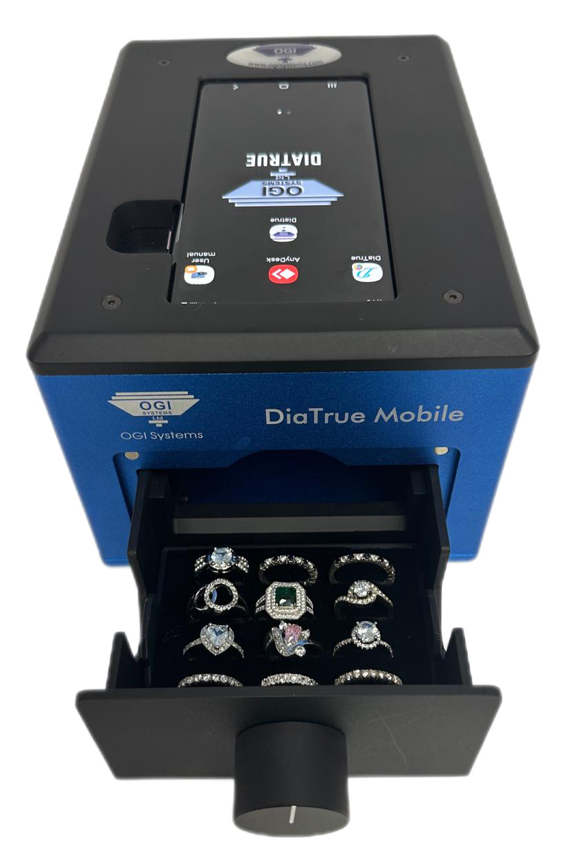 The device can also stones in jewelry (such as rings and earrings). OGI's technology allows the user to rotate (360 degrees) the rings in a specially designed holder and see results in real time.