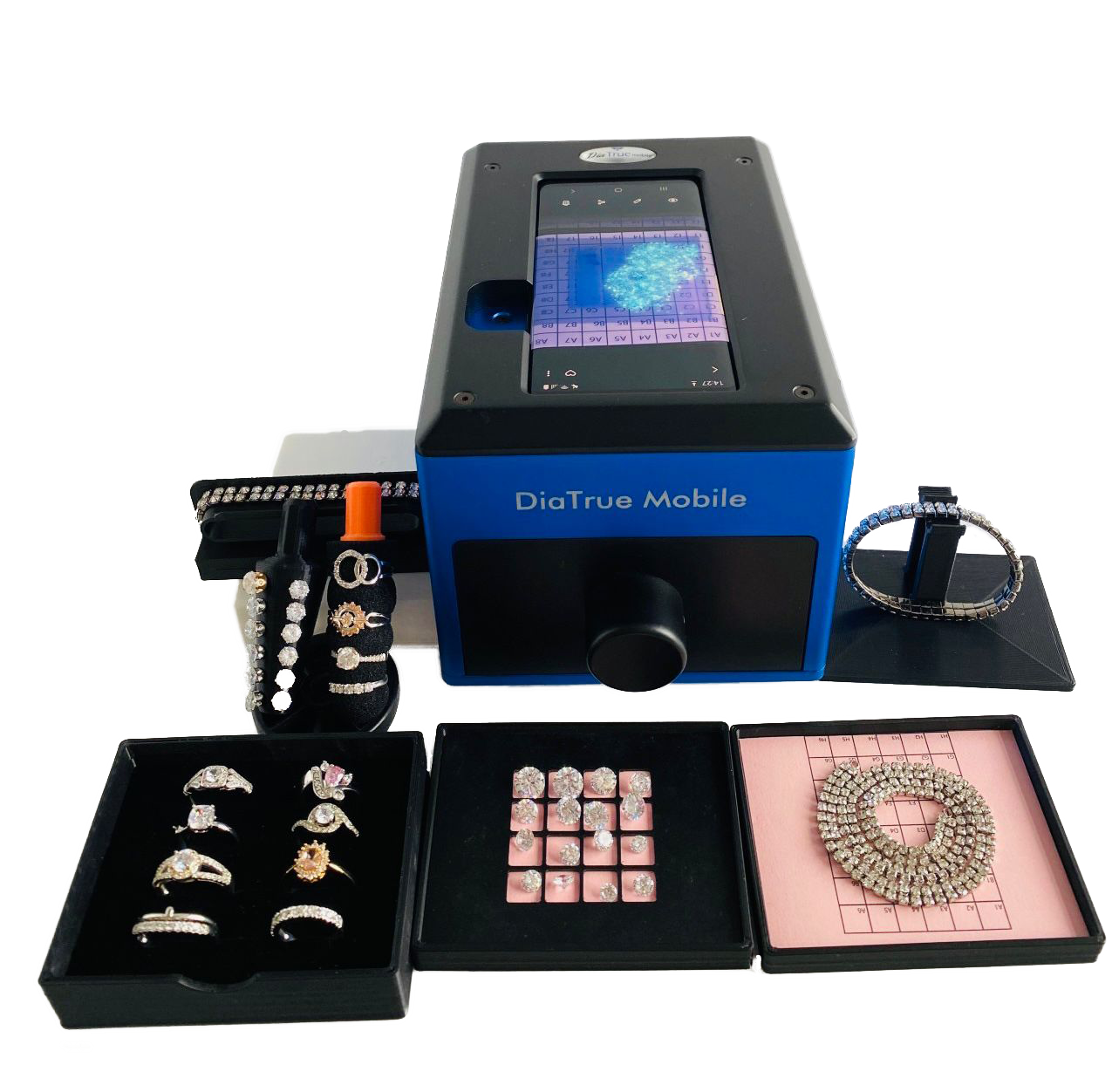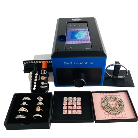 DIATRUE MOBILE detects lab grown CVD, Moissanite, HPHT, CZ, and synthetic diamond coated moissanite and CZ AND SMALL JEWELRY.
