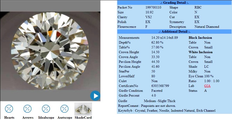 • Round 10.92 CT, N VS2 XXX Fanit GIA.