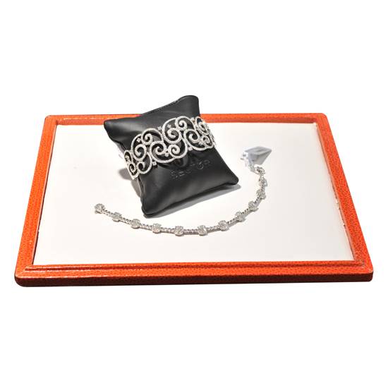 These are a diamond bracelet and a bangle. The bangle is in fancy flower pattern with scroll, which nicely mounted with diamonds in bead setting. The bracelet is mounted with diamonds in prong setting and bar setting.