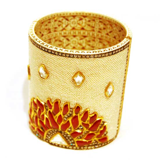 This pictured bangle comes with a touch of exotic elegance. The bangle presents an exquisite blend of diamonds, rubies and pearls. Jazz up your party look with this diva piece.