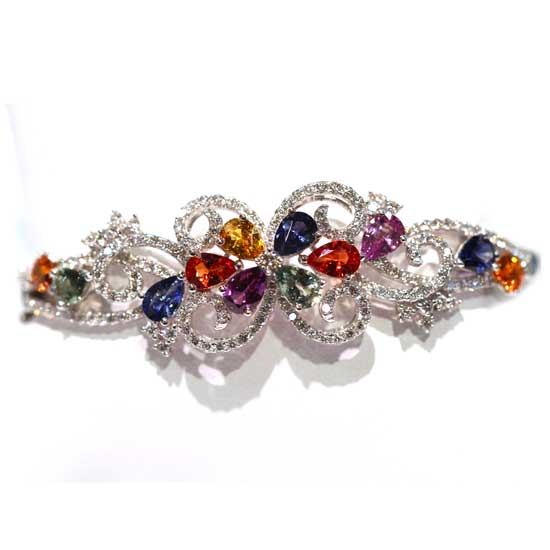 Complement your precious jewelry collection with this sophisticated 18K white gold bangle. The 18K white gold bangle is well embellished with 12 pieces of sapphires in assorted colors with dazzling diamonds, showcasing a sense of brilliance. This 18K white gold is an exquisite jewelry piece for grand evening occasions.