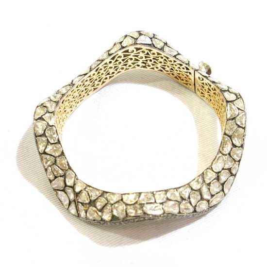 This ladies’ bangle flaunts an irregular structure lavishly adorned with dazzling 18-carat diamonds. The interior ring is ingeniously crafted with a delicate cutout pattern made of 14K gold to air extra aristocratic glitz. Add a touch of glamor to your wrist with this enchanting diamond bangle.