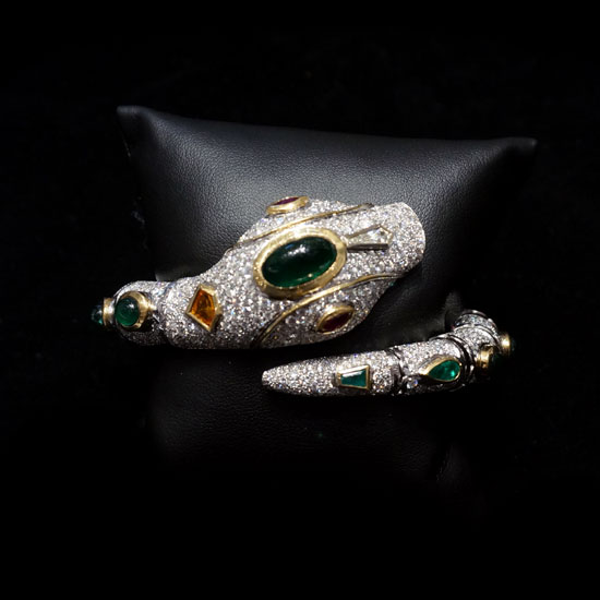 This is a fashionable bangle that is made of white gold and yellow gold. It is accented with diamonds and emeralds for a touch of glamor. This elegant bangle shimmers with a high-gloss finish.