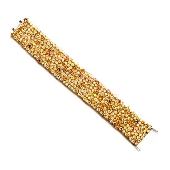 This is a diamond bracelet with 18K yellow gold setting. The wide bracelet is covered with numerous small brilliant-cut diamonds in gold, orange, pink, yellow and natural colour, which is radiant and passionate in style.