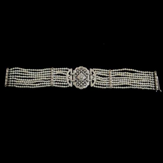 This bracelet is designed in a vintage inspired style. The bracelet is finely crafted in fresh water pearls, diamonds and 18K white gold. The bracelet lines your wrist with an irresistible style.