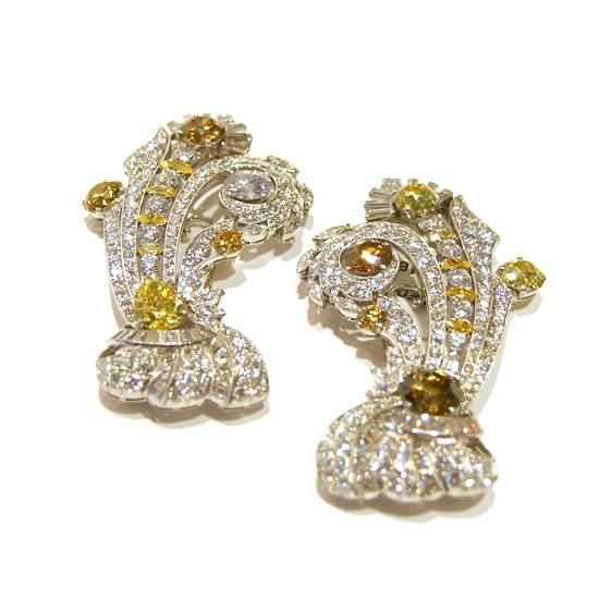 These are two diamond brooches set in platinum. The brooches feature yellow and brown round, oval diamonds set with small round white diamonds. The brooches match different outfits.