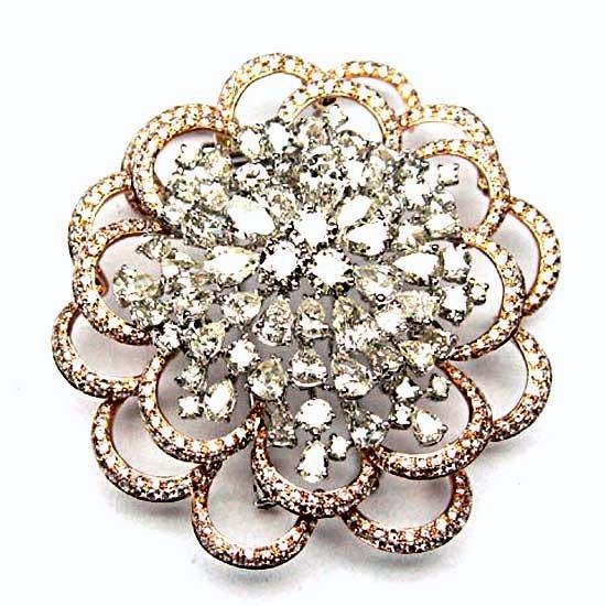 This beautiful brooch features a dazzling 18K gold construction. It boasts a flower-like design with sparkling white and pink diamonds all over. Add this simple yet sophisticated brooch to your jewelry collection.