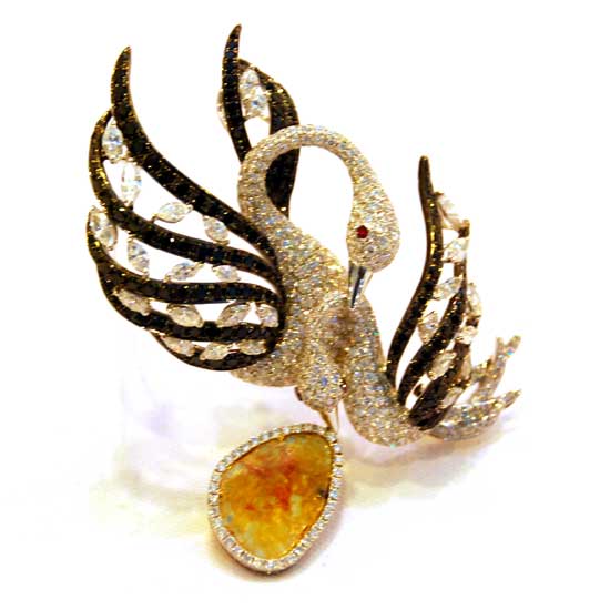Presented here is a brooch that stars a black swan as the prima donna. The black swan is delicately crafted with diamonds, black diamonds and ruby. This dainty swan can also be worn as a pendant to grace your evening look.