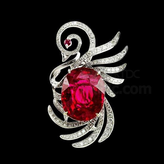 Eternal grace is embodied in this diamond brooch, vividly captured as a swan in charming dance steps. An oval rubellite is centered among the glistening plumes that rise in the air with flowing curves. The refined openwork design features millegrain set diamonds and a ruby gemstone that bestows soul to the precious jewelry.
