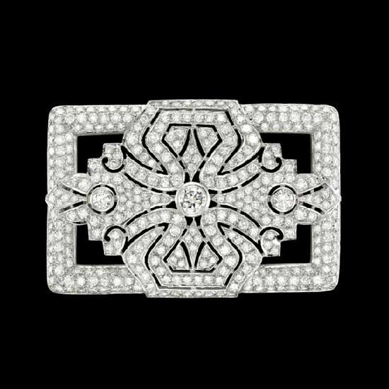 Displayed is a diamond brooch that comes in a rectangular shape with symmetrical decorations. Professionally cut, the diamonds shines like stars, giving this jewelry piece a glamorous style. This beautiful diamond brooch is a great choice for formal occasions.
