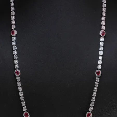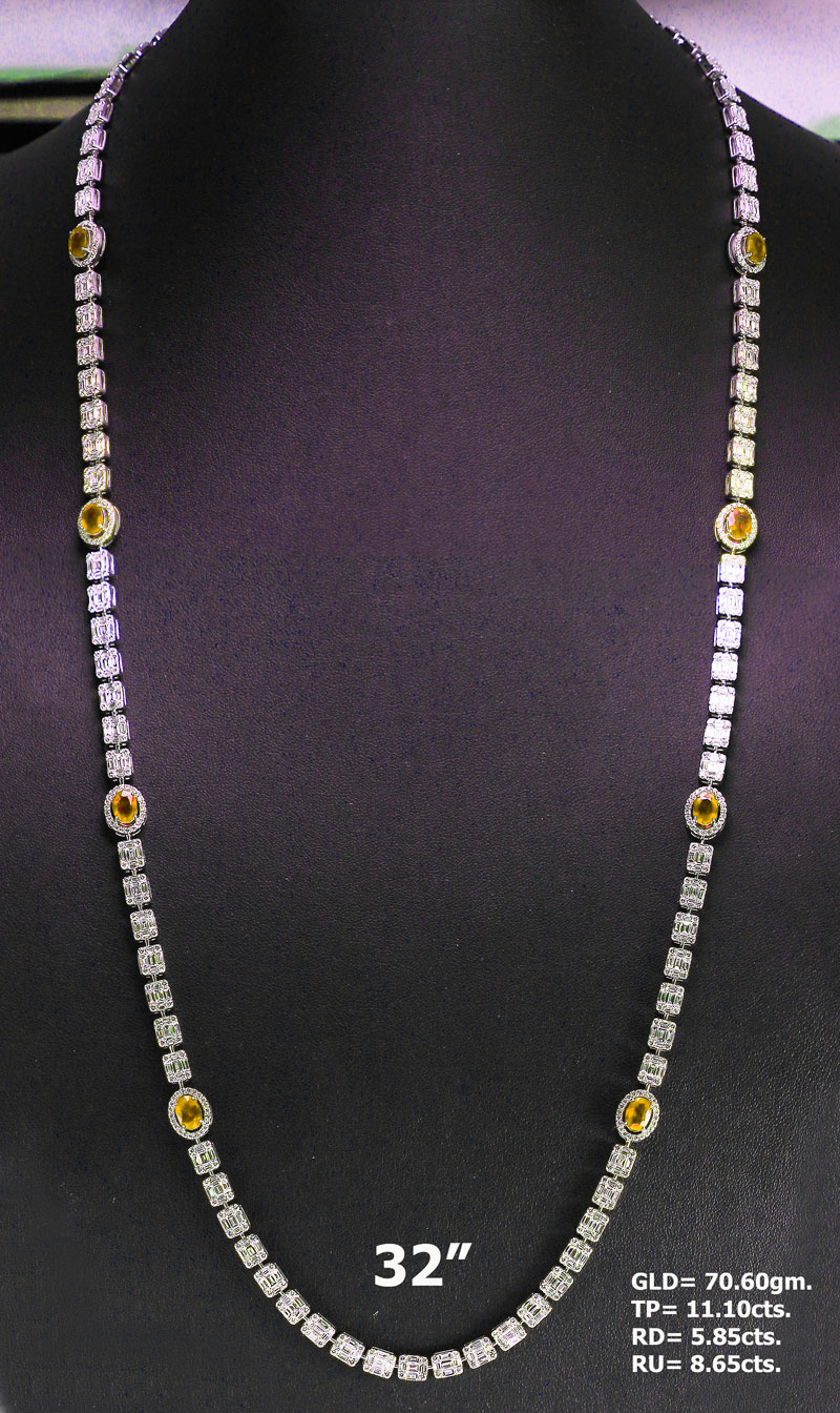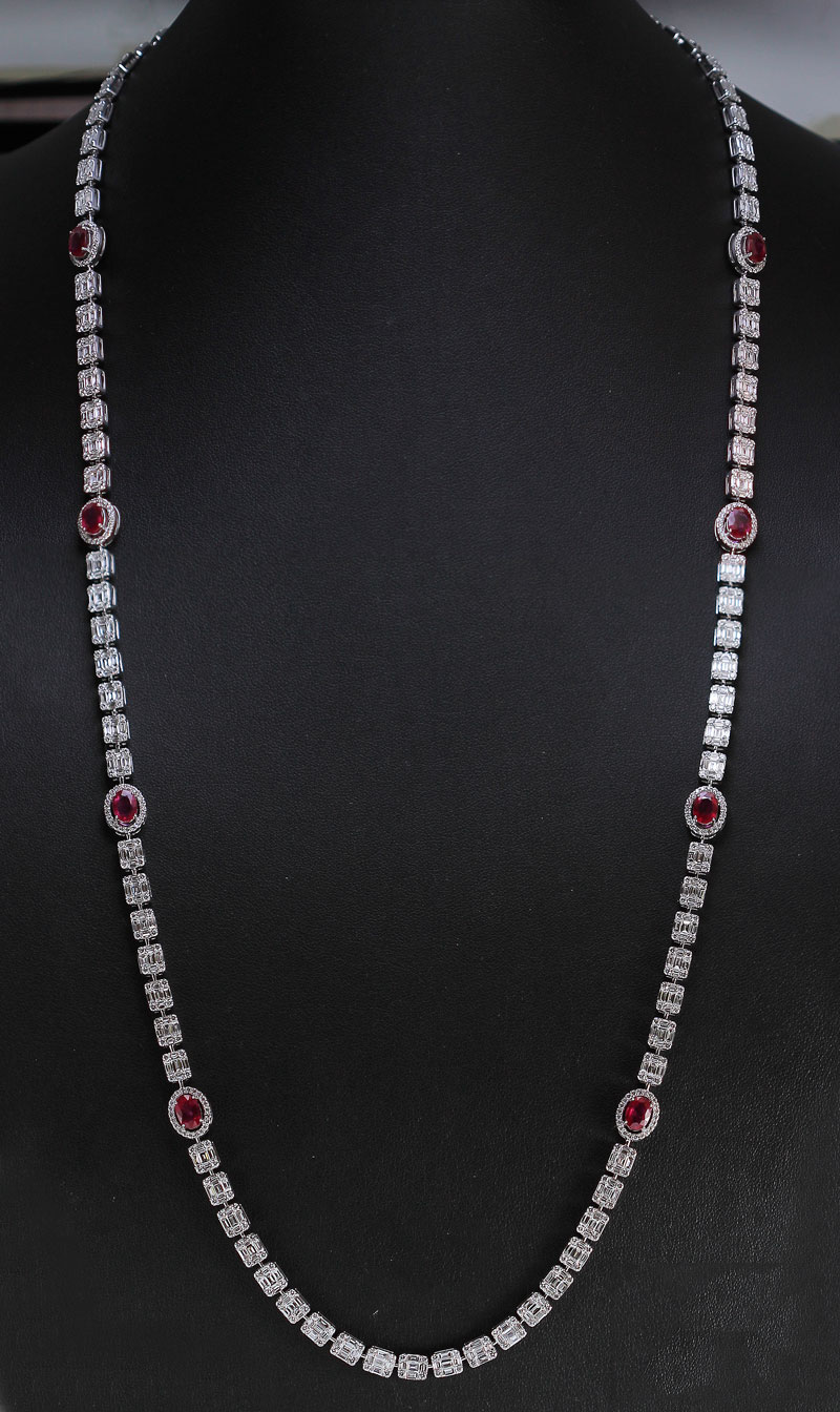 • 32 Inch long chain studded with Emerald cut composite setting diamonds along with Rubies.