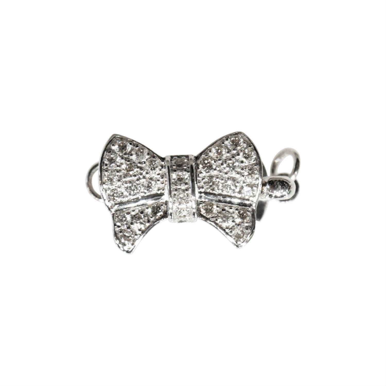 Peppered with 30 diamond specks, this little clasp adds considerable glitz and glamor to any pearl necklace. The clasp showcases a well-liked, feminine bow design crafted with a beautifully burnished, 18 k white gold setting. Molded with 2 loops on either side, this decorative clasp clings to a single-strand pearl necklace.