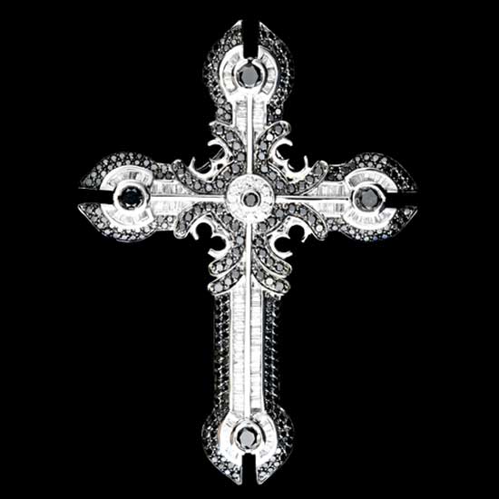 Showcased is a diamond pendant featuring an ancient cross in white gold. It is encrusted with black and white diamonds to render stunning shimmer. This delicately crafted cross pendant is an exceptional addition for jewelry collectors.